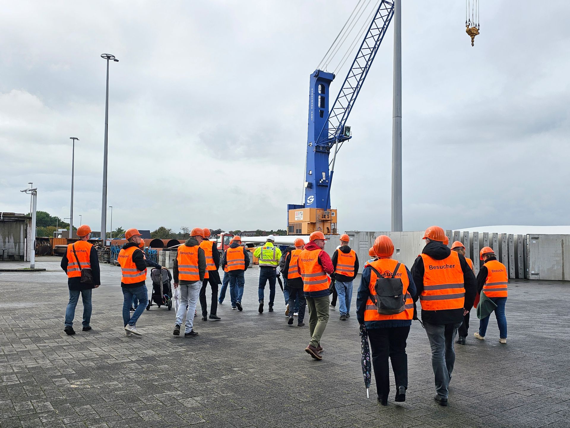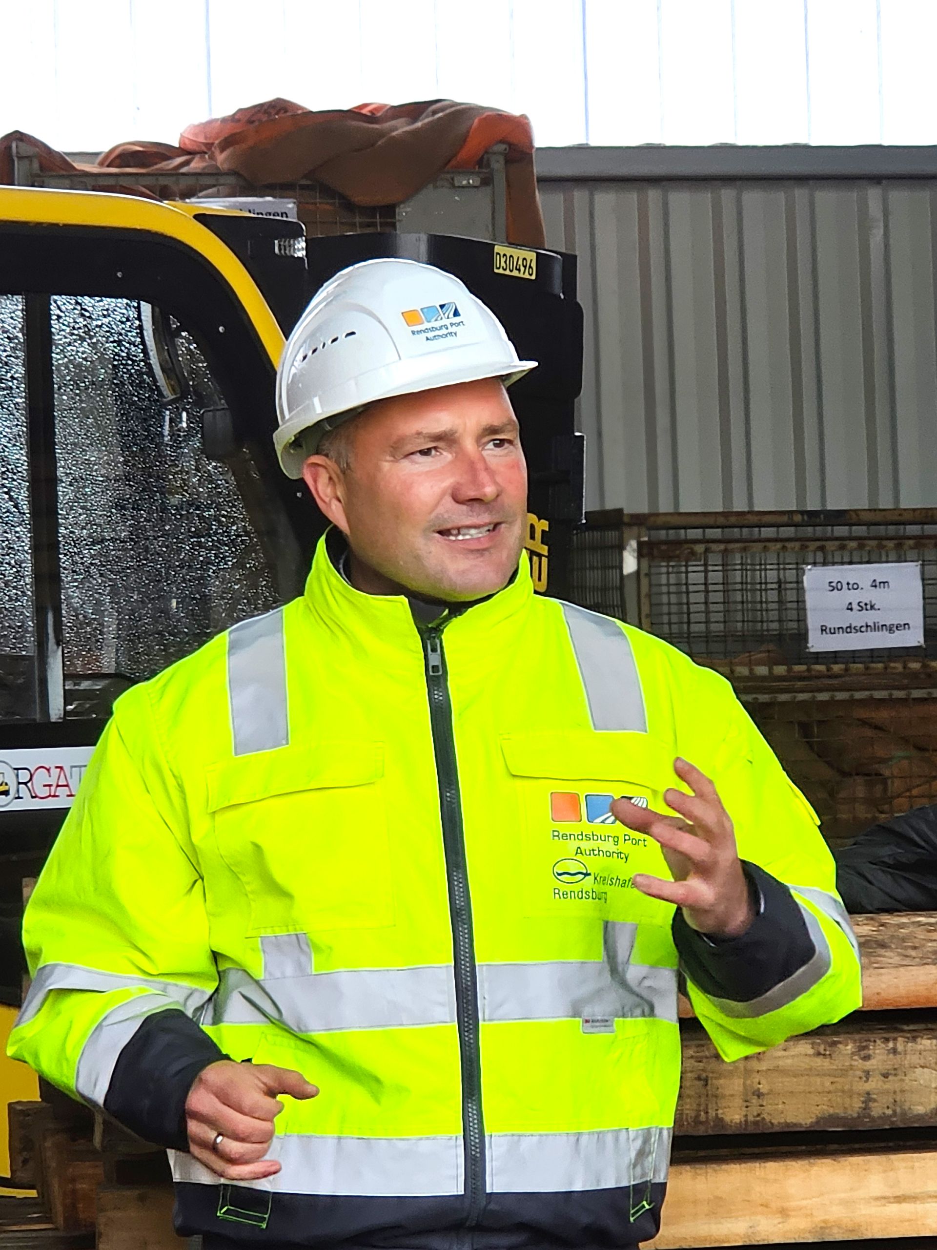 Zu Beginn begrüßte Kai Lass, Geschäftsführer der Rendsburg Port Authority GmbH die Gruppen im Schwerlasthafen. Er führte eindrucksvoll vor Augen, welche Rolle der Hafen in der Region spielt. Die Firma Enercon liefert hier beispielsweise Windkraftteile an und seit 2014 ist die Firma Max Bögl (Bau von Windkrafttürmen) hier ansässig. Rund 60 bis 70 Prozent der umgeschlagenen Güter sind windkraftbezogen.