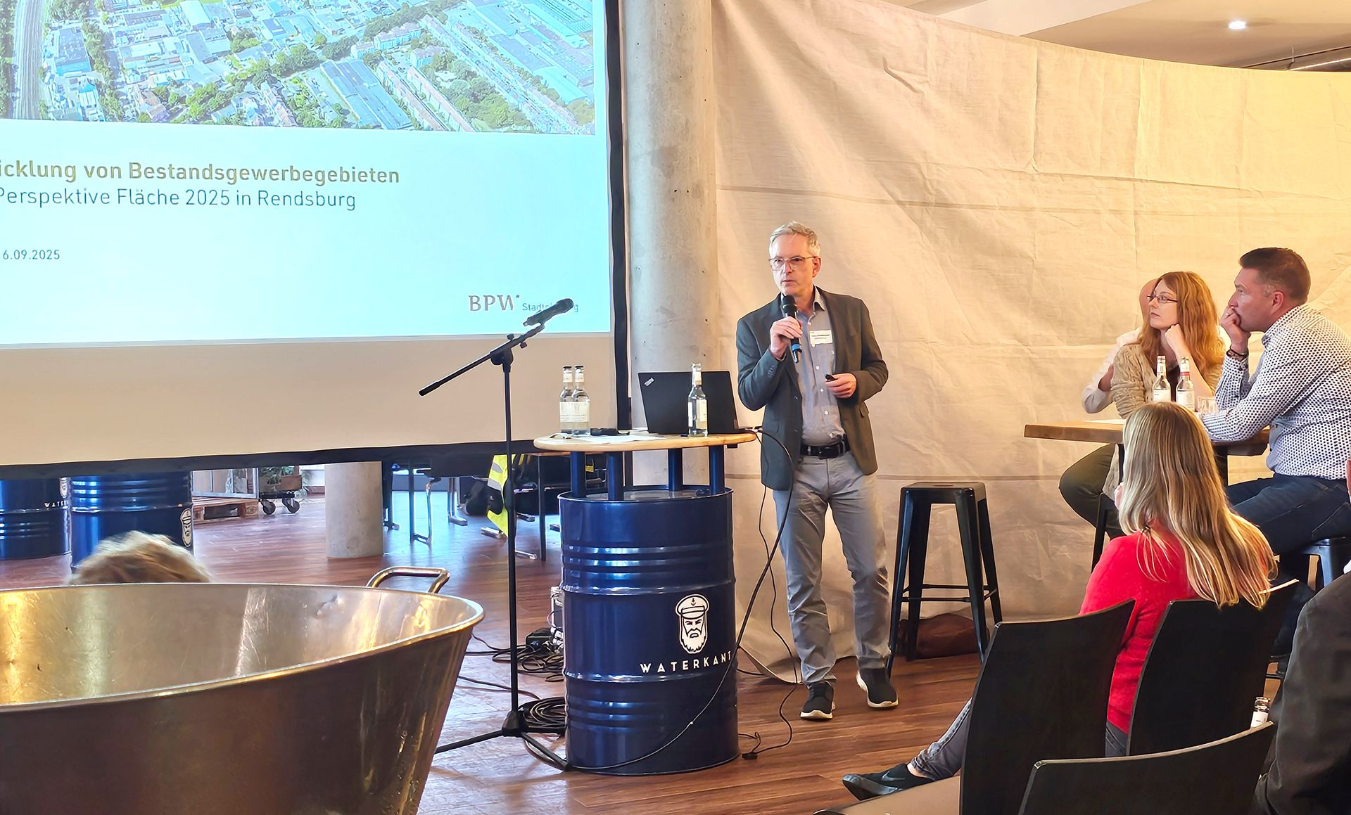 Frank Schlegelmilch (BPW Stadtplanung) informierte im Anschluss über die Weiterentwicklung bestehender Gewerbeflächen. Er zeigte auf, dass sich die Arbeit lohnt: mit Sofortmaßnahmen, der Identifizierung von Fördermöglichkeiten und dem Wissen der aktuellen Forschungslandschaft Ein Gebietsmanager*in könnte in Bestandsgebieten beispielsweise koordinierend wirken und Politik, Verbände und Schlüsselunternehmen an einen Tisch bringen.