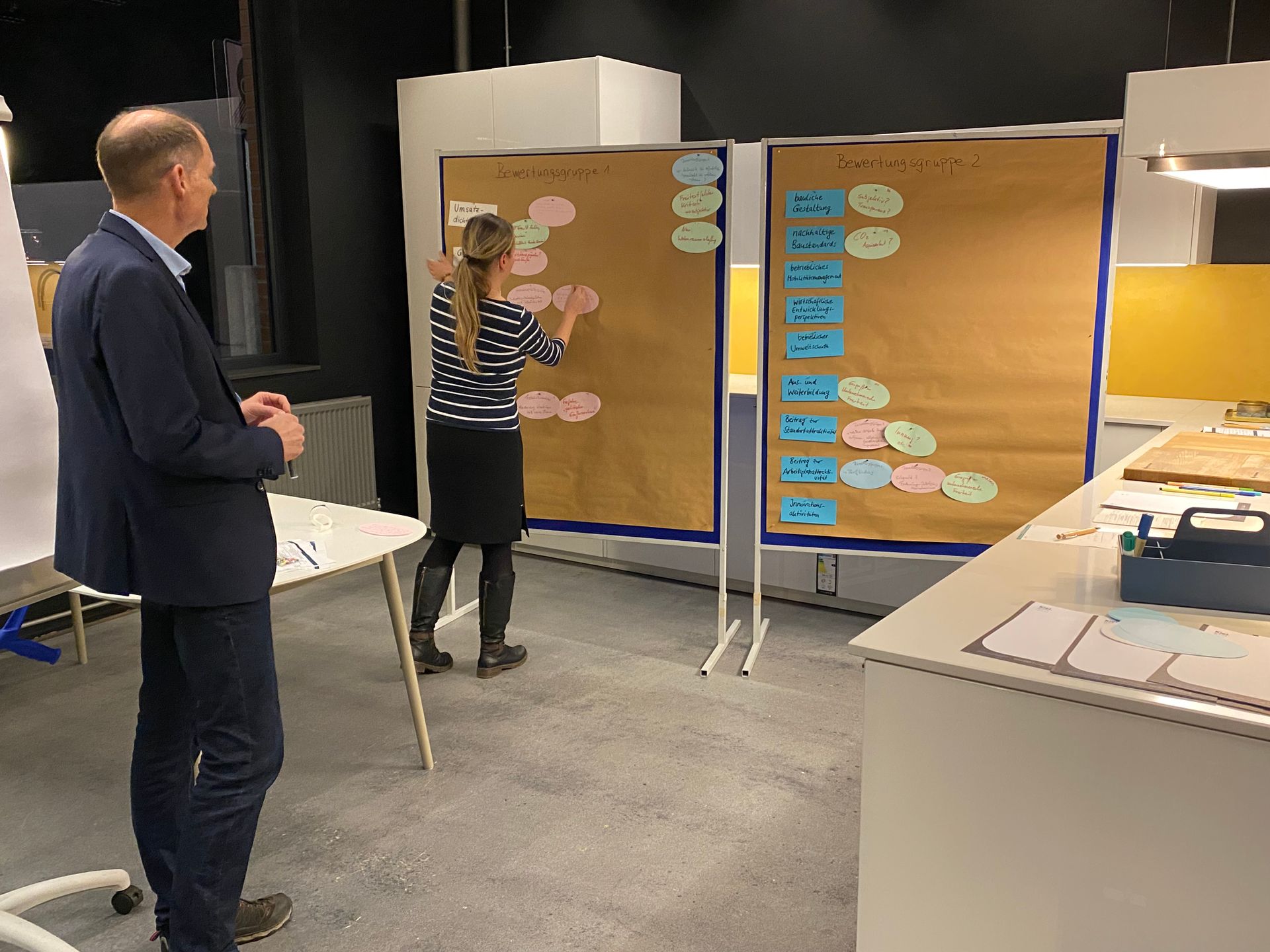 Im ersten Teil des Workshops lag der Fokus darauf, diesen aktuellen Diskussionsstand der Vergabekriterien zu präsentieren und das gemeinsame Ziel zu bestimmen. An verschiedenen Arbeitsstationen wurden die vorgeschlagenen Kriterien vorgestellt, in Arbeitsgruppen intensiv diskutiert und aus verschiedenen Perspektiven der unterschiedlichen Stakeholder beleuchtet. Die Teilnehmenden hatten die Möglichkeit, Ergänzungen vorzuschlagen, kritische Punkte anzusprechen und gezielt Veränderungen einzubringen. So entstand ein erster, praxisnaher Abgleich zwischen den Anforderungen der Stadt, den Bedürfnissen der Unternehmen und den Erfahrungen aus anderen Kommunen.