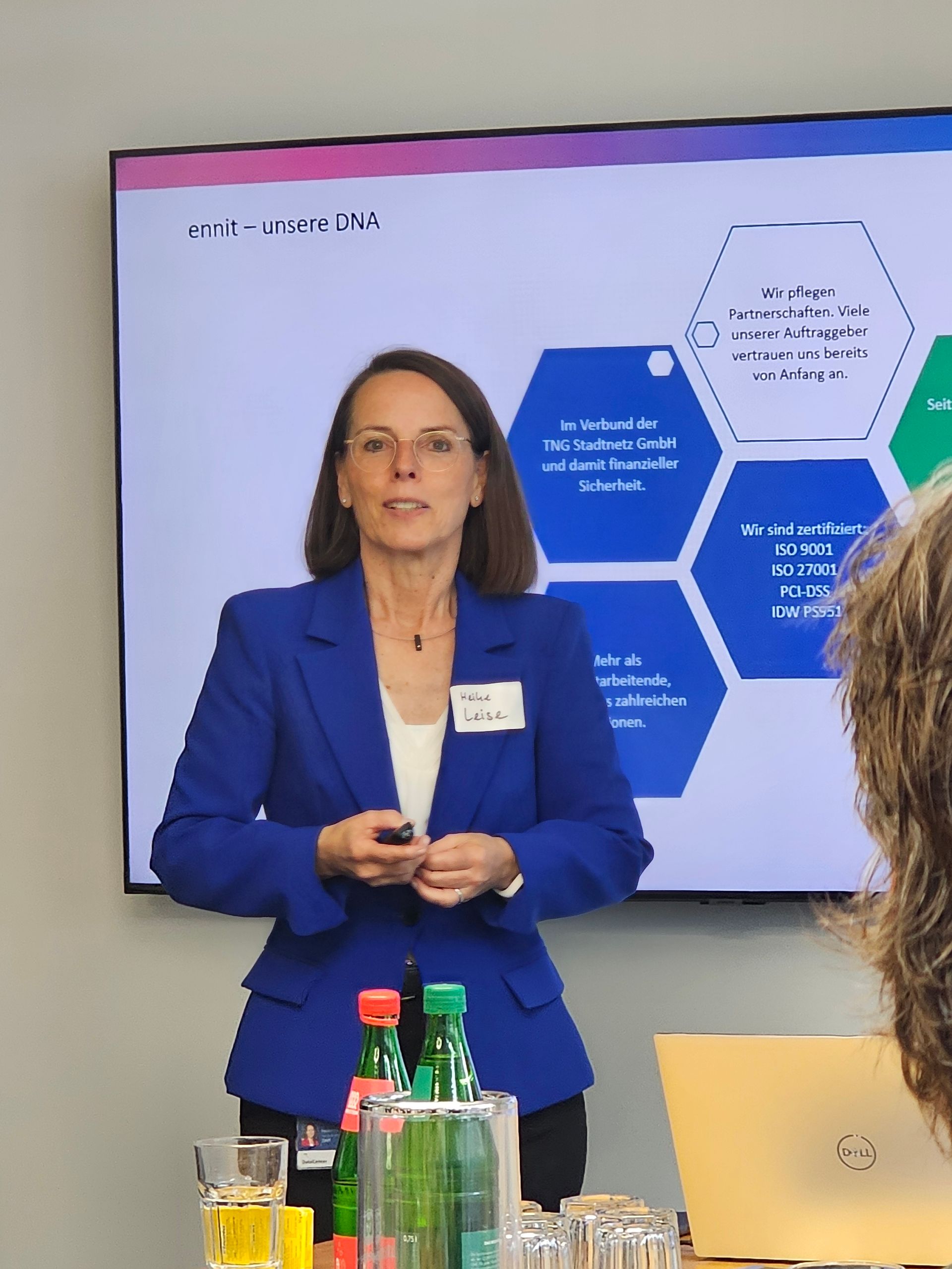 Heike Leise, Geschäftsführerin der ennit GmbH, begrüßte die Gäste mit einem kurzen Überblick über das Unternehmen. Die ennit GmbH unterstützt Kund*innen in ganz Deutschland mit IT-Infrastruktur, Cybersicherheitsberatung und Managed Services – und das auch mit einem Fokus auf Nachhaltigkeit.