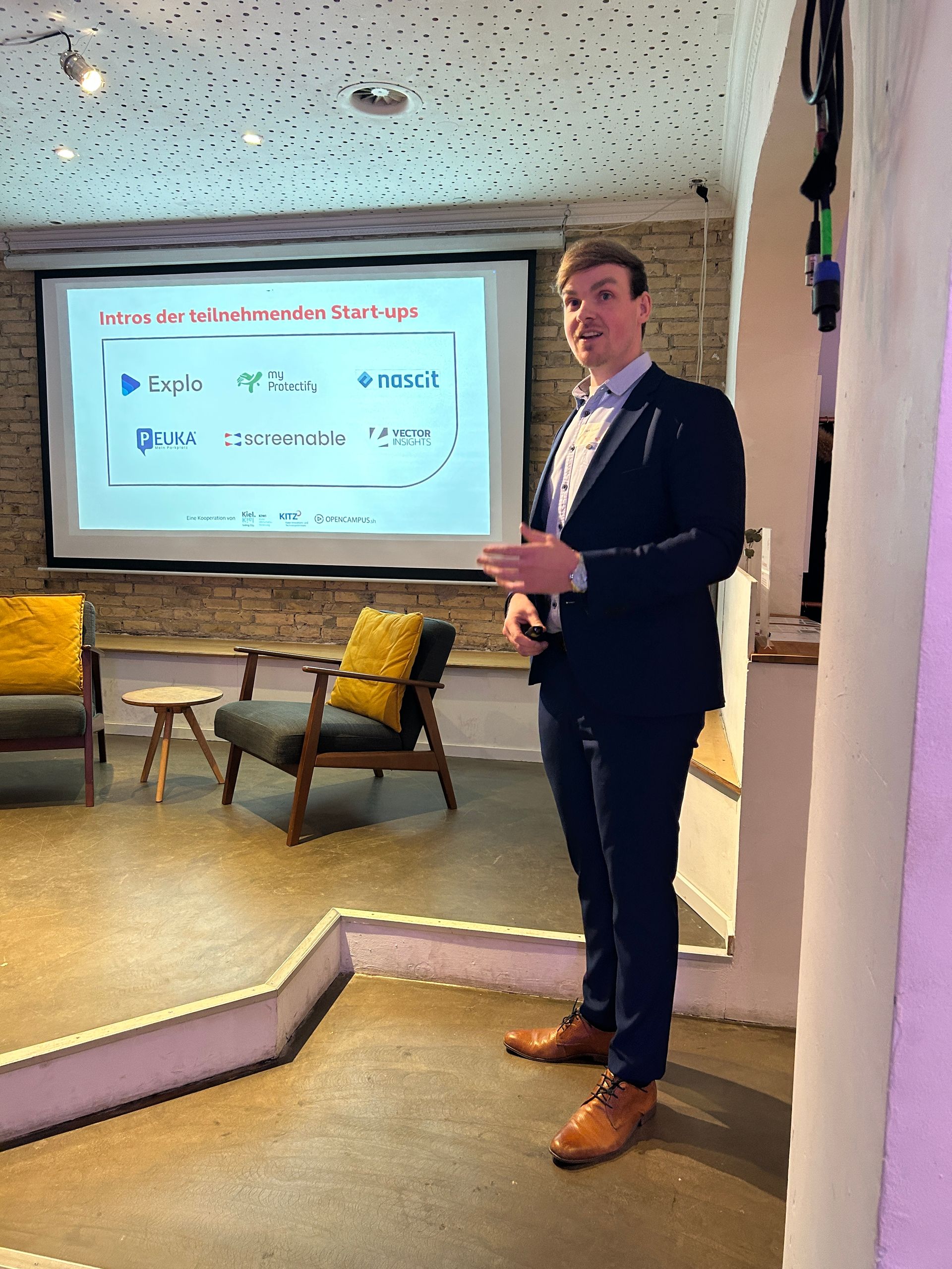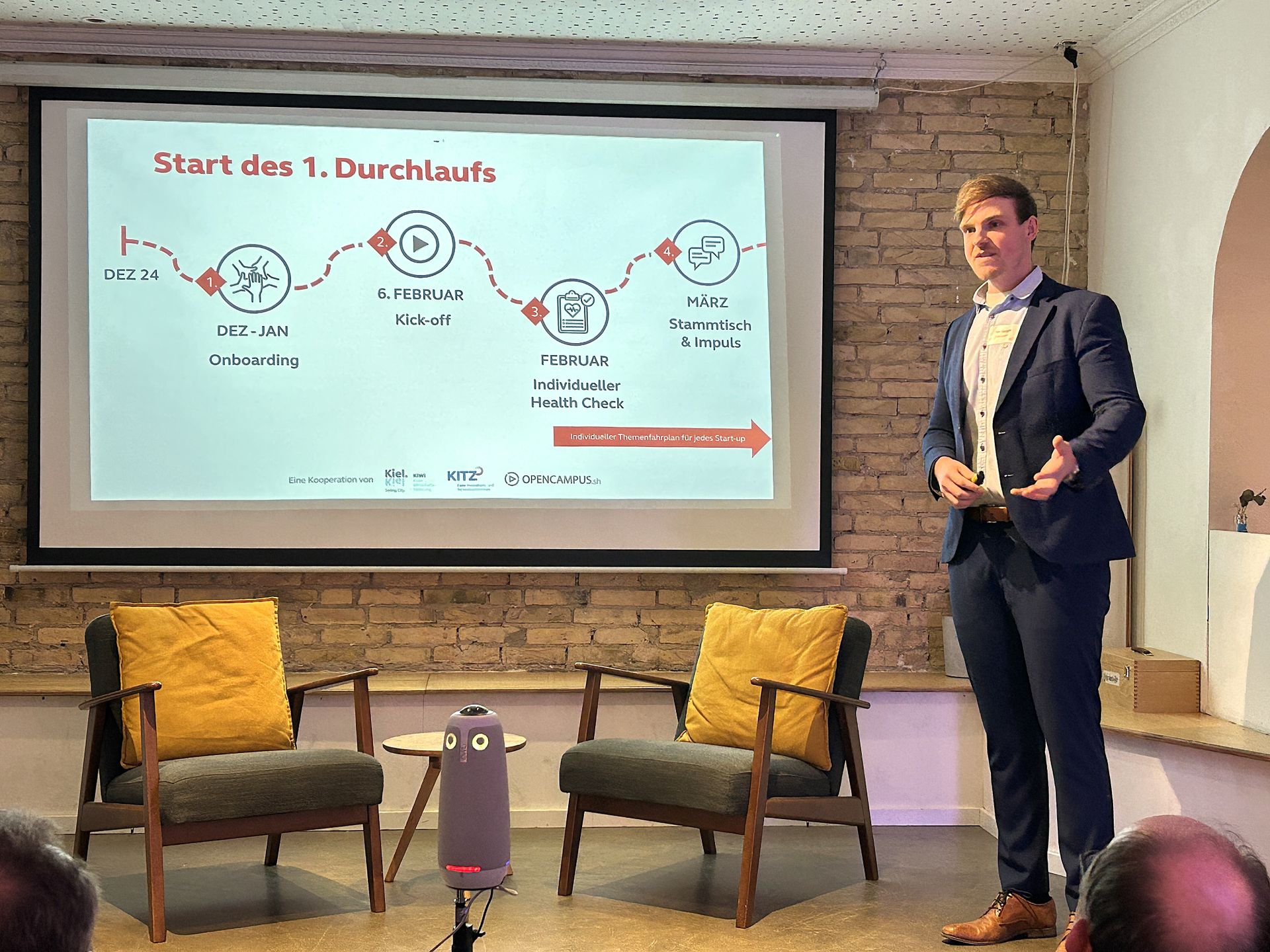 Die Veranstaltung begann mit einer Begrüßung durch unseren Geschäftsführer Werner Kässens, gefolgt von den Kooperationspartnern Andree Mehrens (Kieler Innovations- und Technologiezenrum) und Alexander Ohrt (opencampus.sh). Anschließend übernahm unser Start-up-Berater Jan Genge die Moderation des Abends.