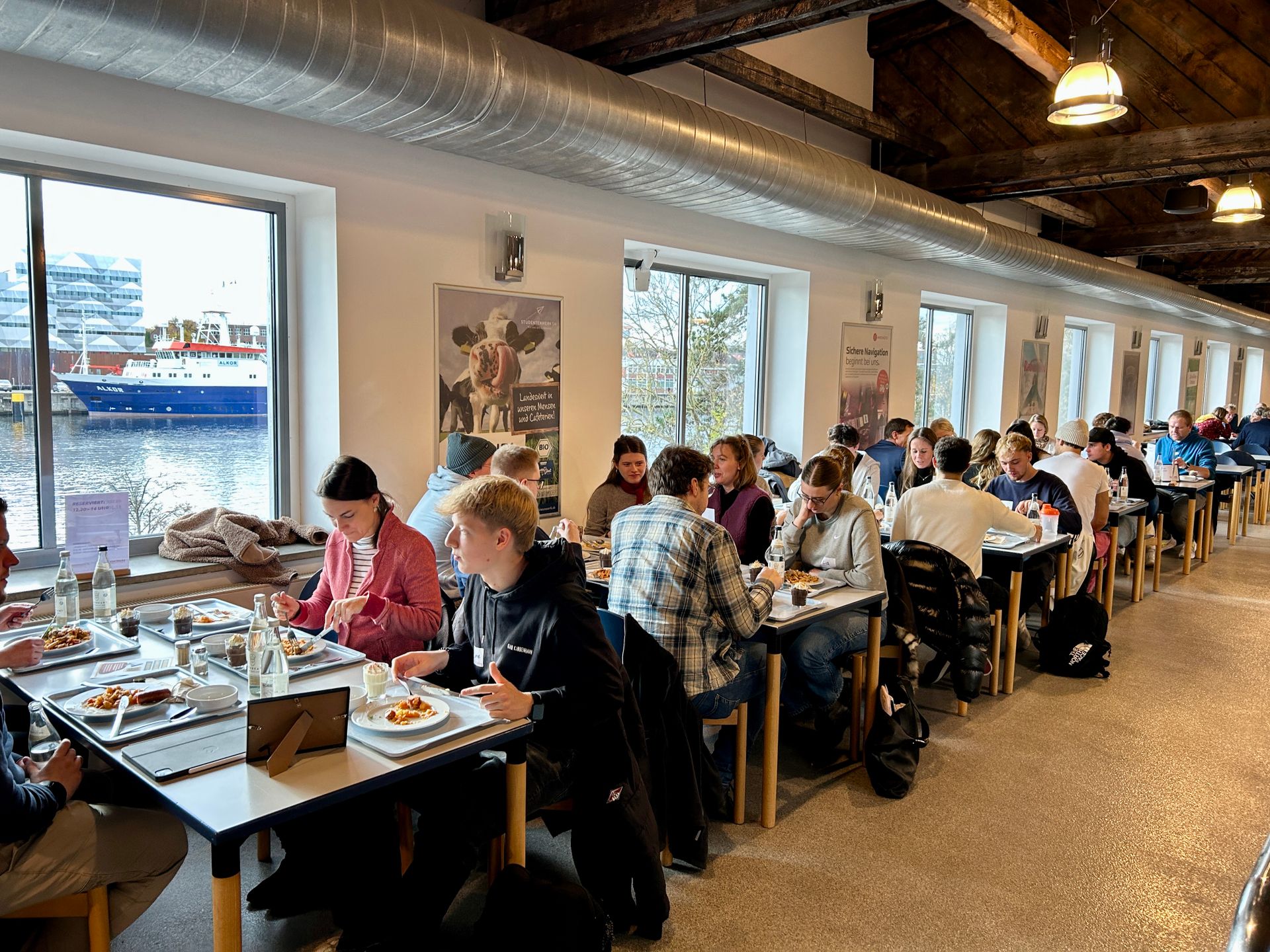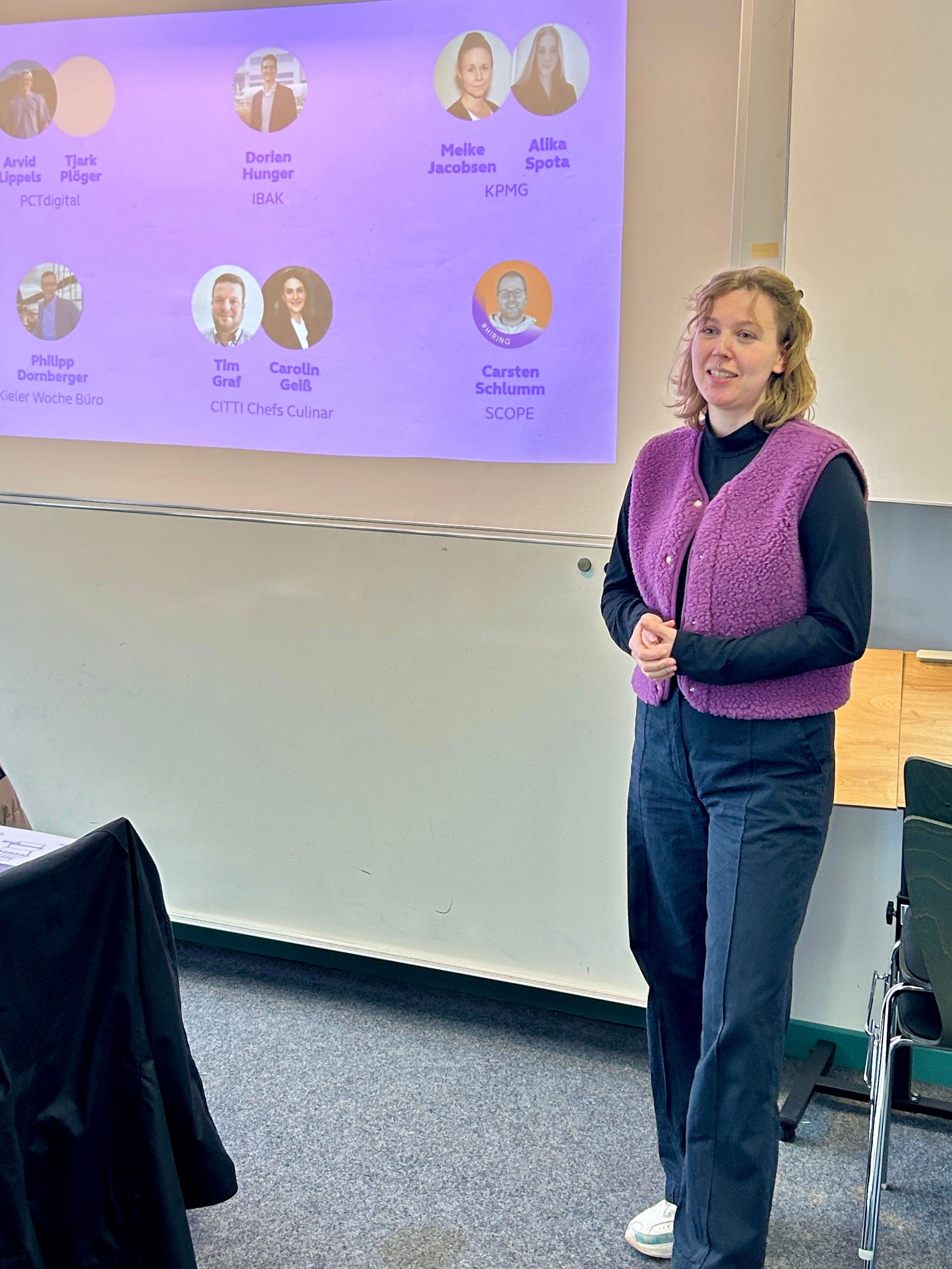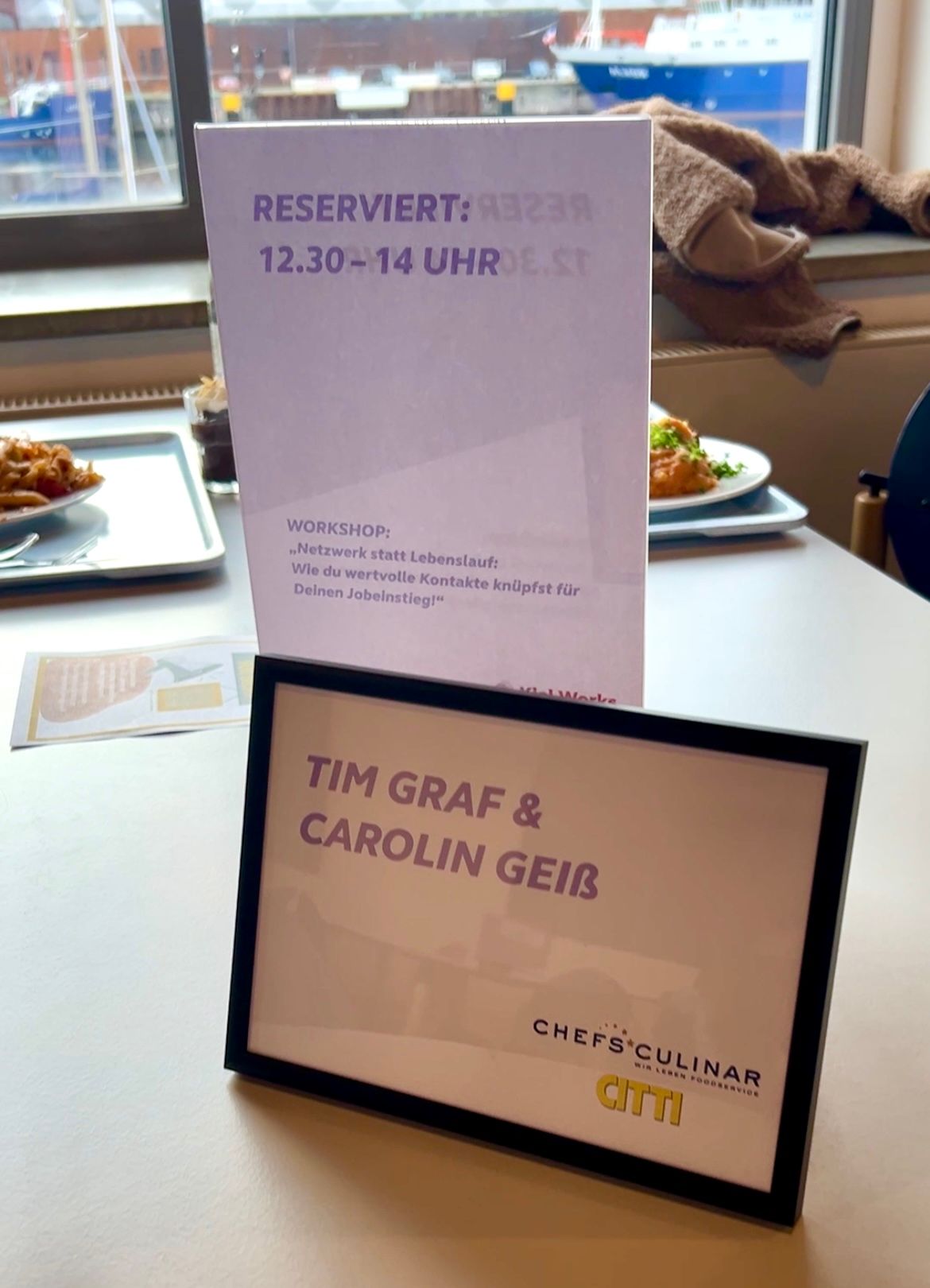 Ein besonderes Highlight des Workshops war das gemeinsame Mittagessen mit Mitarbeitenden von den sechs Kieler Unternehmen: CITTI/Chefs Culinar, PCT Digital, IBAK, KPMG, SCOPE Engineering und dem Kieler Woche-Büro. Hier konnten die Studierenden ihre erlernten Skills direkt anwenden und wertvolle Gespräche führen.
