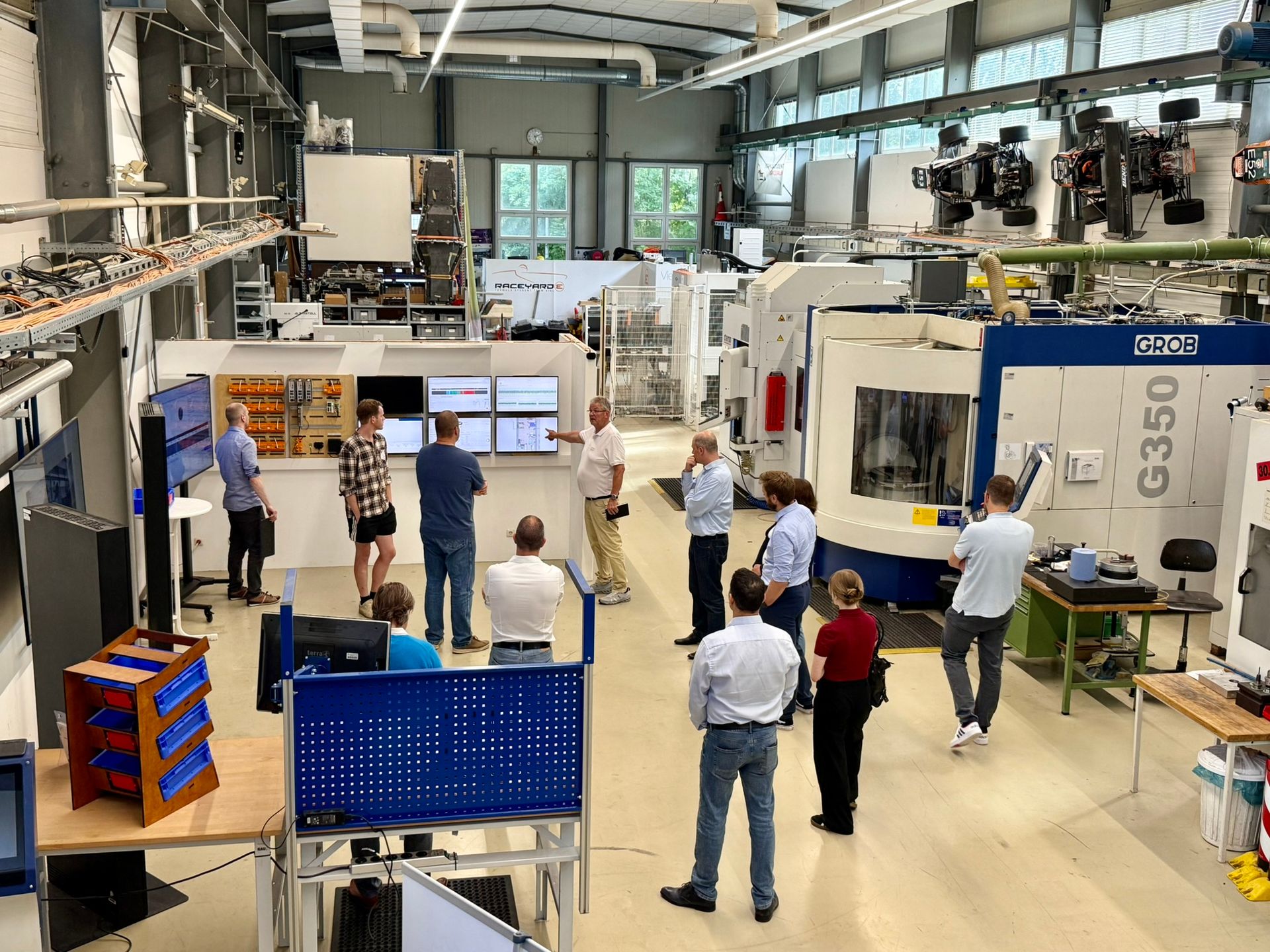 Bei der anschließenden Führung durch die Digitale Fabrik des CIMTT probierten die Teilnehmenden unterschiedliche, modernste Technologien aus. Tim Johannsen vom Digital Learning Campus stellte aktuelle Entwicklungen vor, betonte die Bedeutung der Zugänglichkeit von Technologien und machte diese direkt erlebbar: Mithilfe einer Virtual-Reality-Brille und eines interaktiven Tools begab sich die Gruppe auf eine virtuelle Erkundungstour der Internationalen Raumstation ISS.